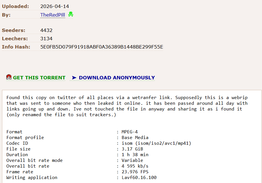 Multiple copies were uploaded to torrent sites and are widely shared, making it the second most pirated movie of the past week. This includes a copy that was uploaded to The Pirate Bay by “TheRedPill,” who referenced the ongoing whack-a-mole at other platforms in the upload description.